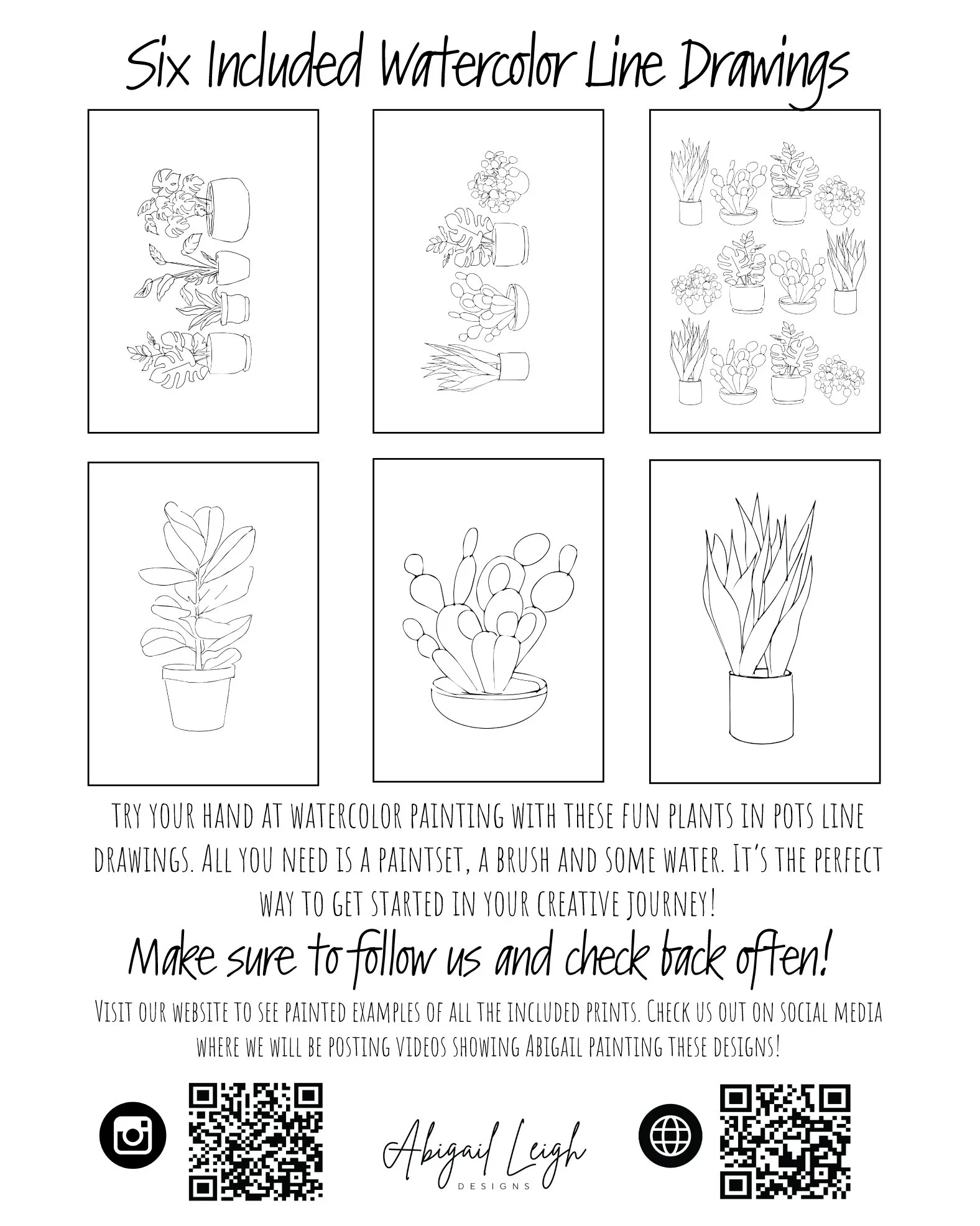 @abigailleighdesigns or click the links at the bottom of this page. Check back often because we will be creating a video series featuring Abigail painting each one of these line drawings. We will also be giving tips and tricks to help with your watercolor journey. Please also share you creations and tag us when possible. We want to see what you are making!
